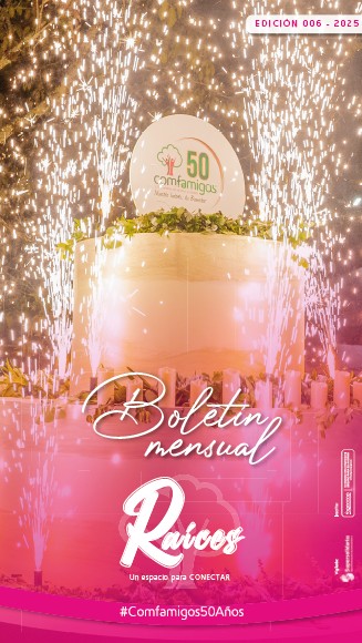 ¡Llegamos a la sexta edición de RAÍCES! ✨ En COMFAMIGOS nos llena de orgullo seguir creciendo contigo y mantener viva esa conexión que nos une como familia cooperativa. RAÍCES no es solo un boletín, es un espacio para compartir noticias, beneficios y experiencias que reflejan lo que somos y lo que construimos juntos. 🌿 Gracias por ser parte de esta historia que sigue floreciendo. ¡Acompáñanos en esta nueva edición y descubre todo lo que tenemos preparado para ti!